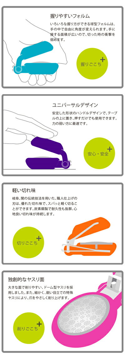 商品の仕様 ●サイズ/縦7.6×横4.5×高さ3.8cm●重さ/80g●材質/刃:炭素鋼、本体:ABS樹脂、やすり:ステンレス刃物鋼 【長谷川刃物】 --------------------------------------------------------- 爪切り 安心・安全 幼児 子供用 高齢者 手の力が弱い爪切り Nail+ ネイルプラス 握りやすく安定したフォルムの爪切り。